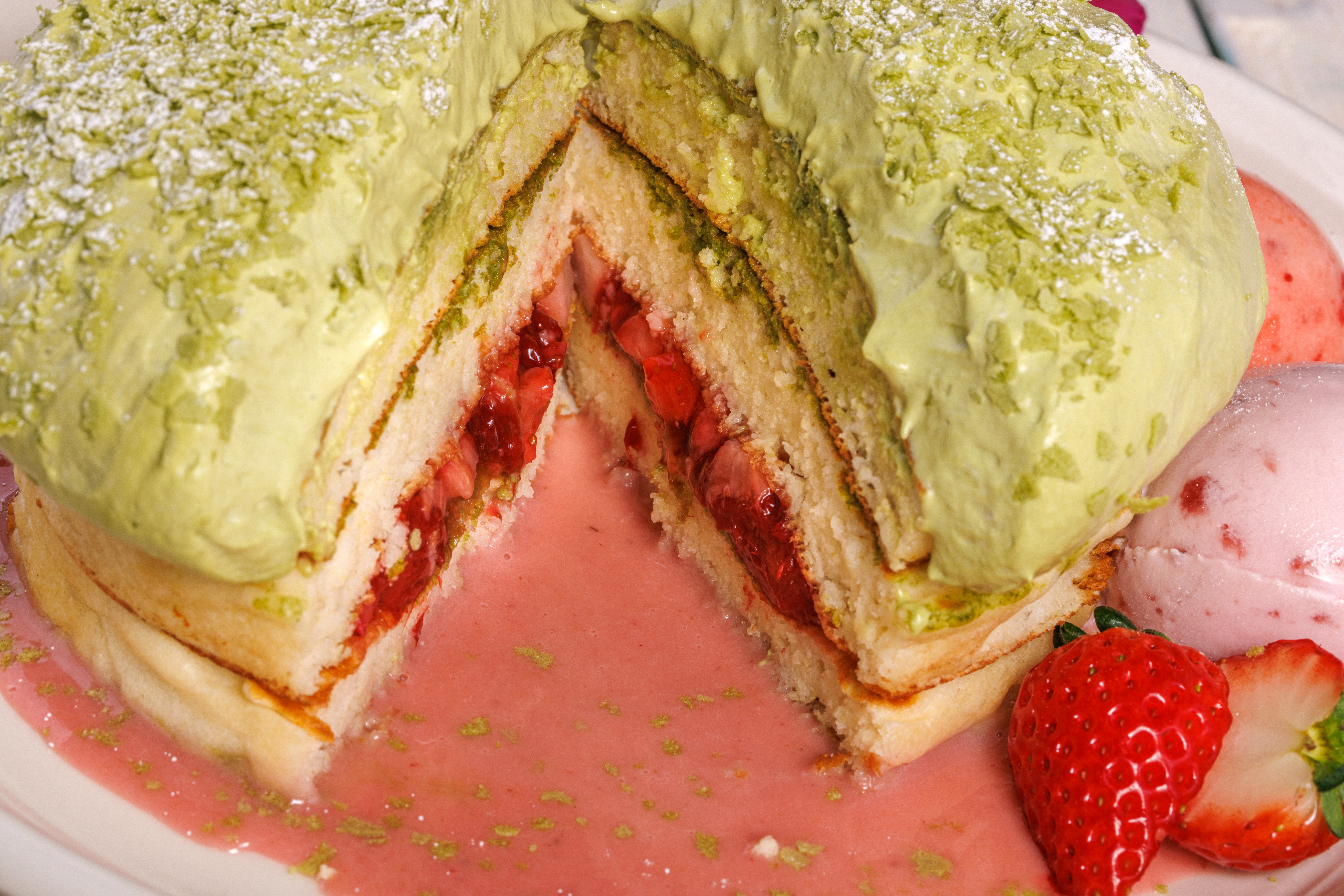 パンケーキの間には、抹茶のシロップと苺のコンフィを丁寧に忍ばせています。ナイフを縦に入れ、たっぷりとかけた濃厚な抹茶クリームと一緒にお召し上がりください。ふわりと広がる抹茶の香りと、苺の豊かな甘酸っぱさが織りなす、和と洋のマリアージュが口いっぱいに広がります。